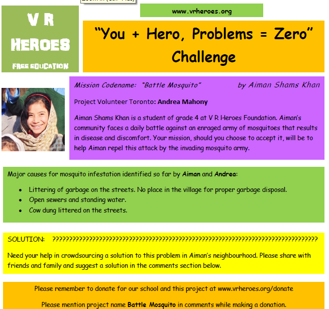 Aiman Shams Khan is a student of grade 4 at V R Heroes Foundation. Aiman’s community faces a daily battle against an enraged army of mosquitoes that results in disease and discomfort. Your mission, should you choose to accept it, will be to help Aiman repel this attack by the invading mosquito army.